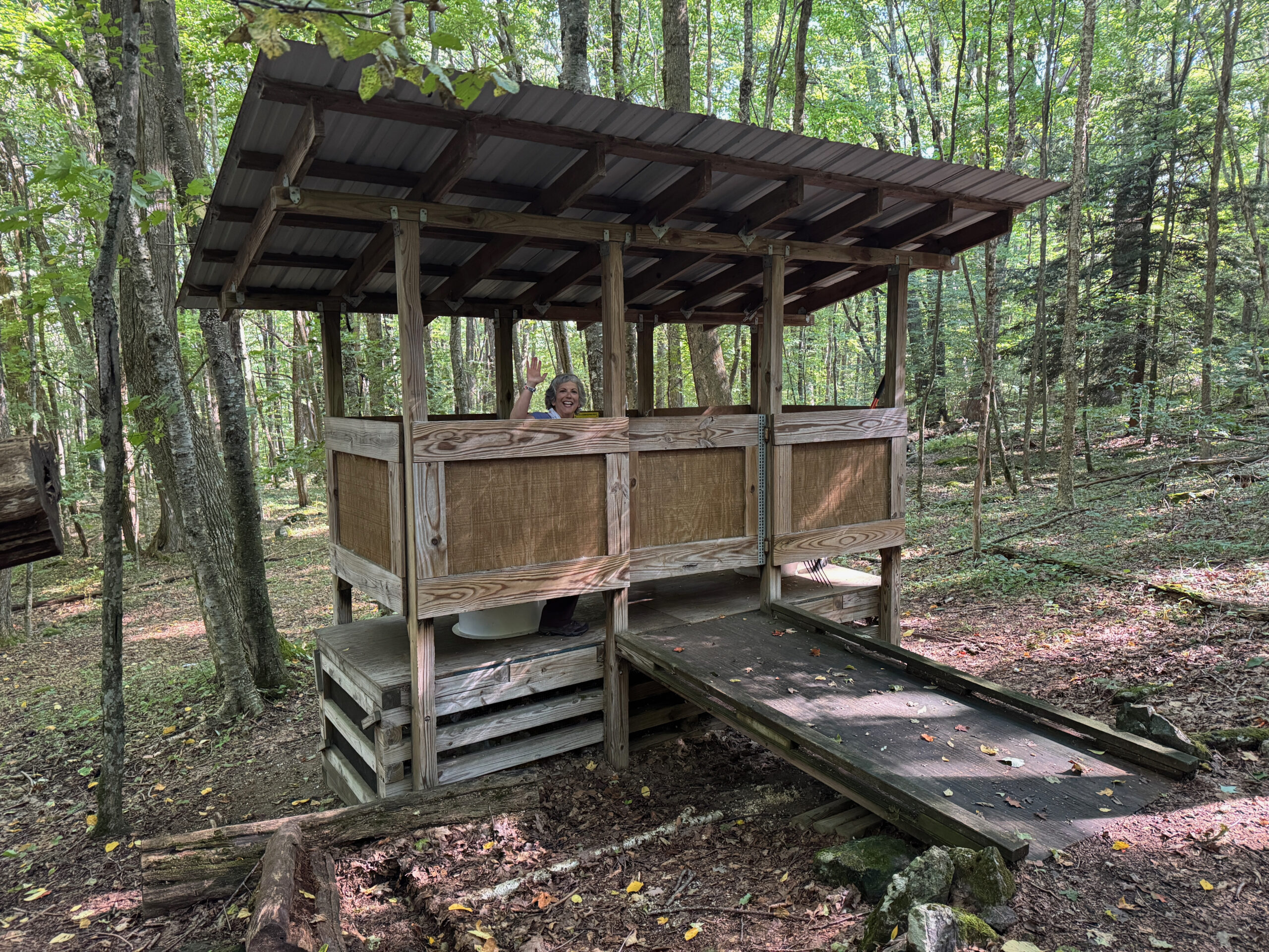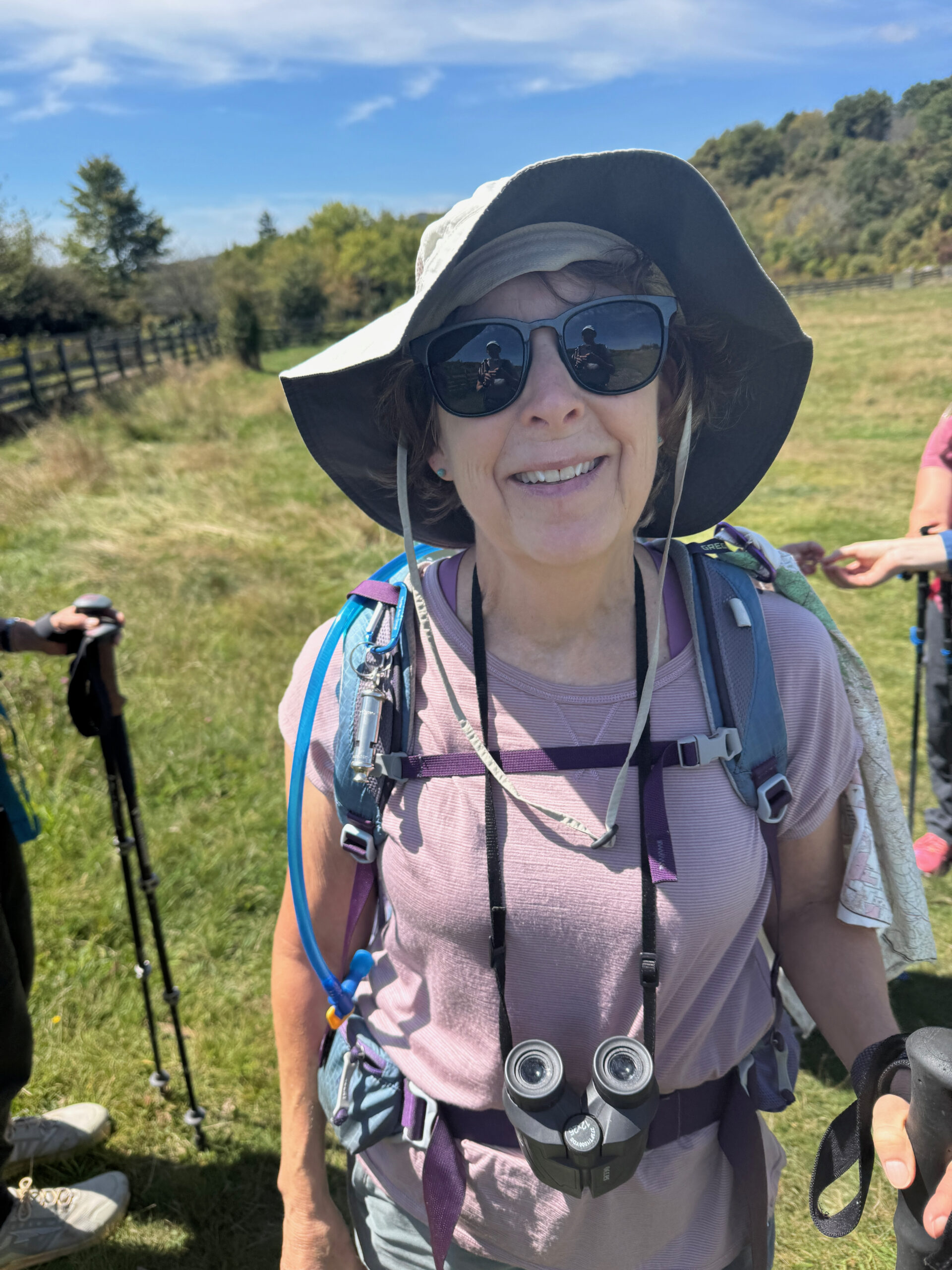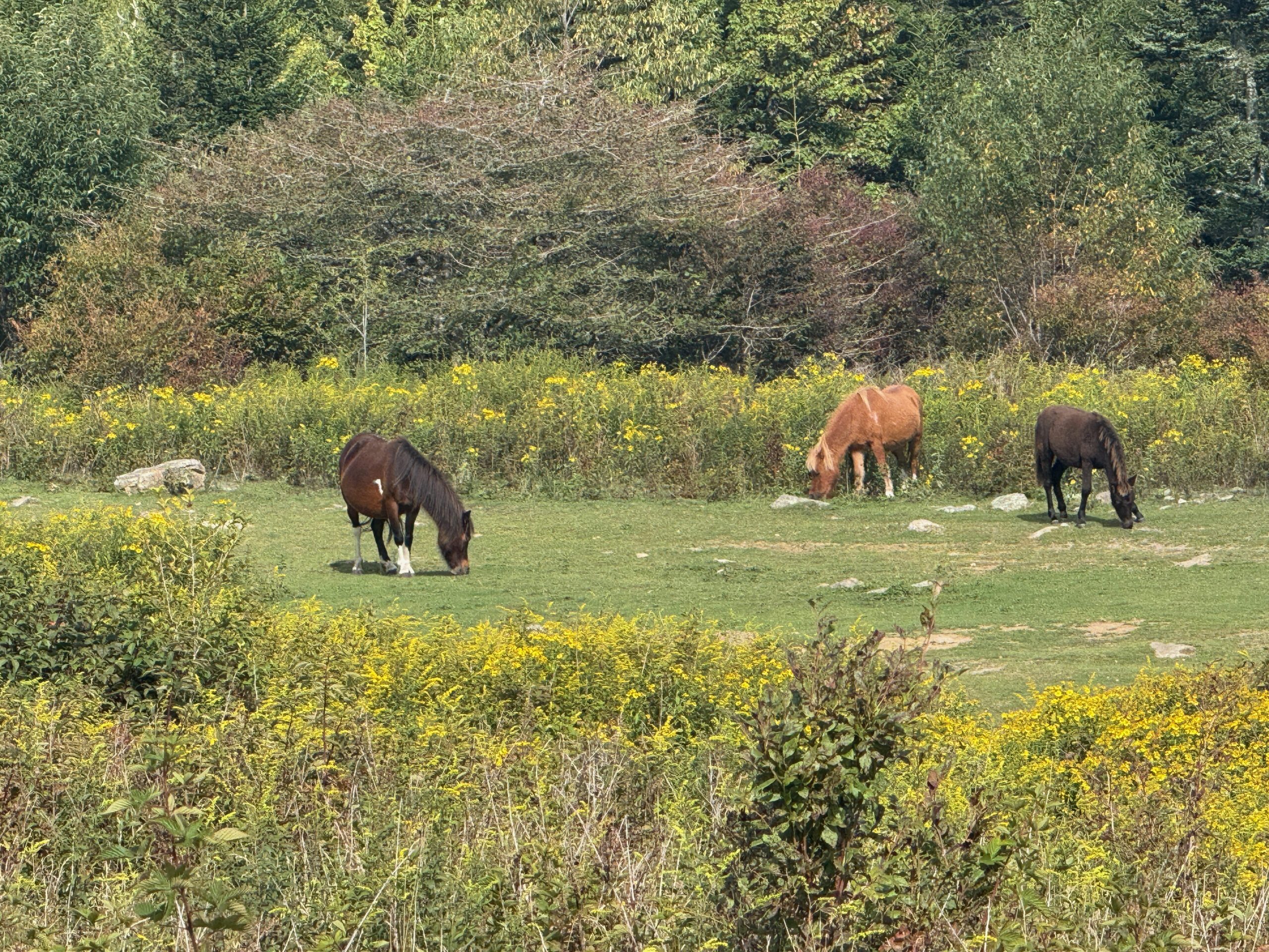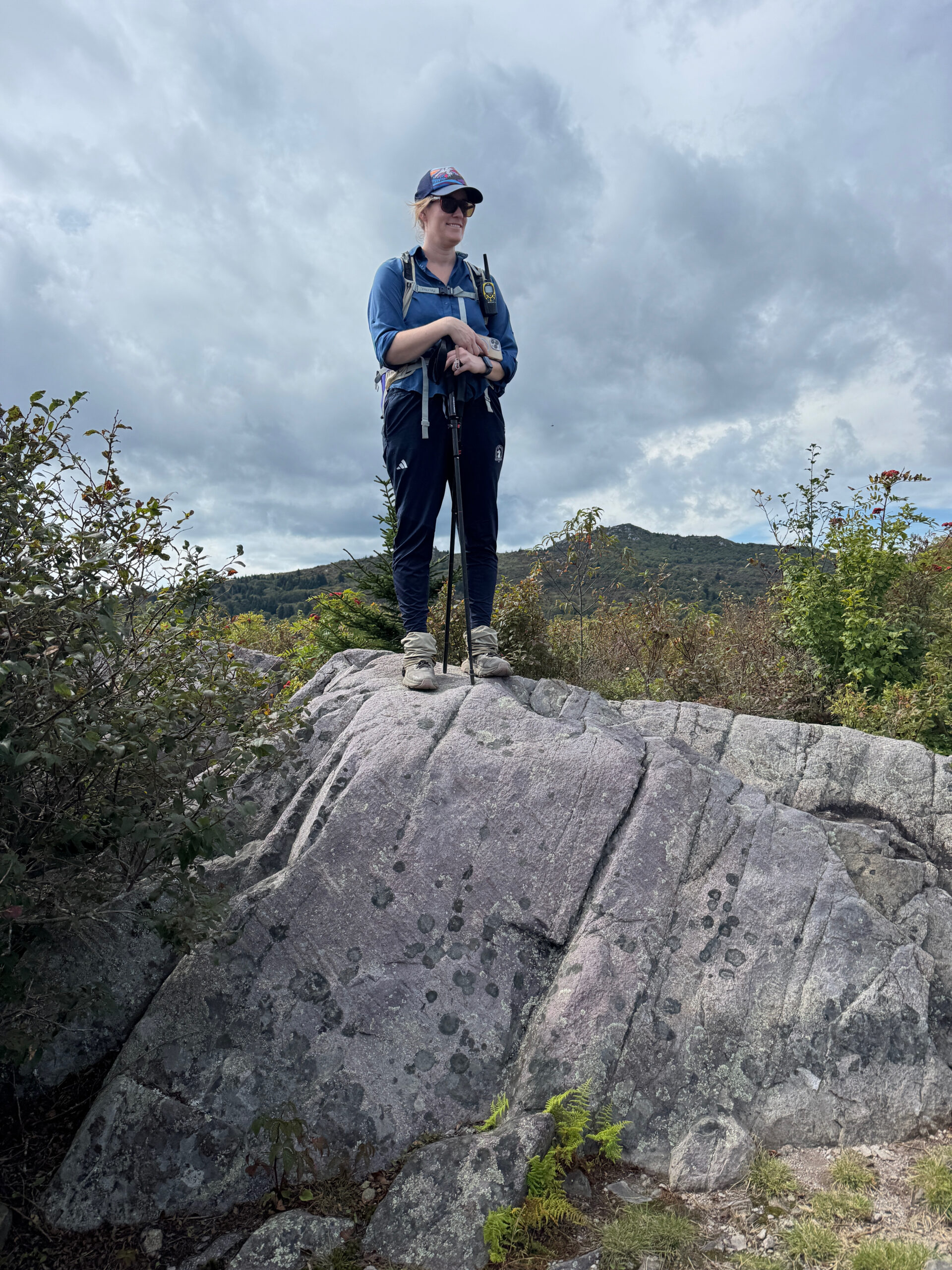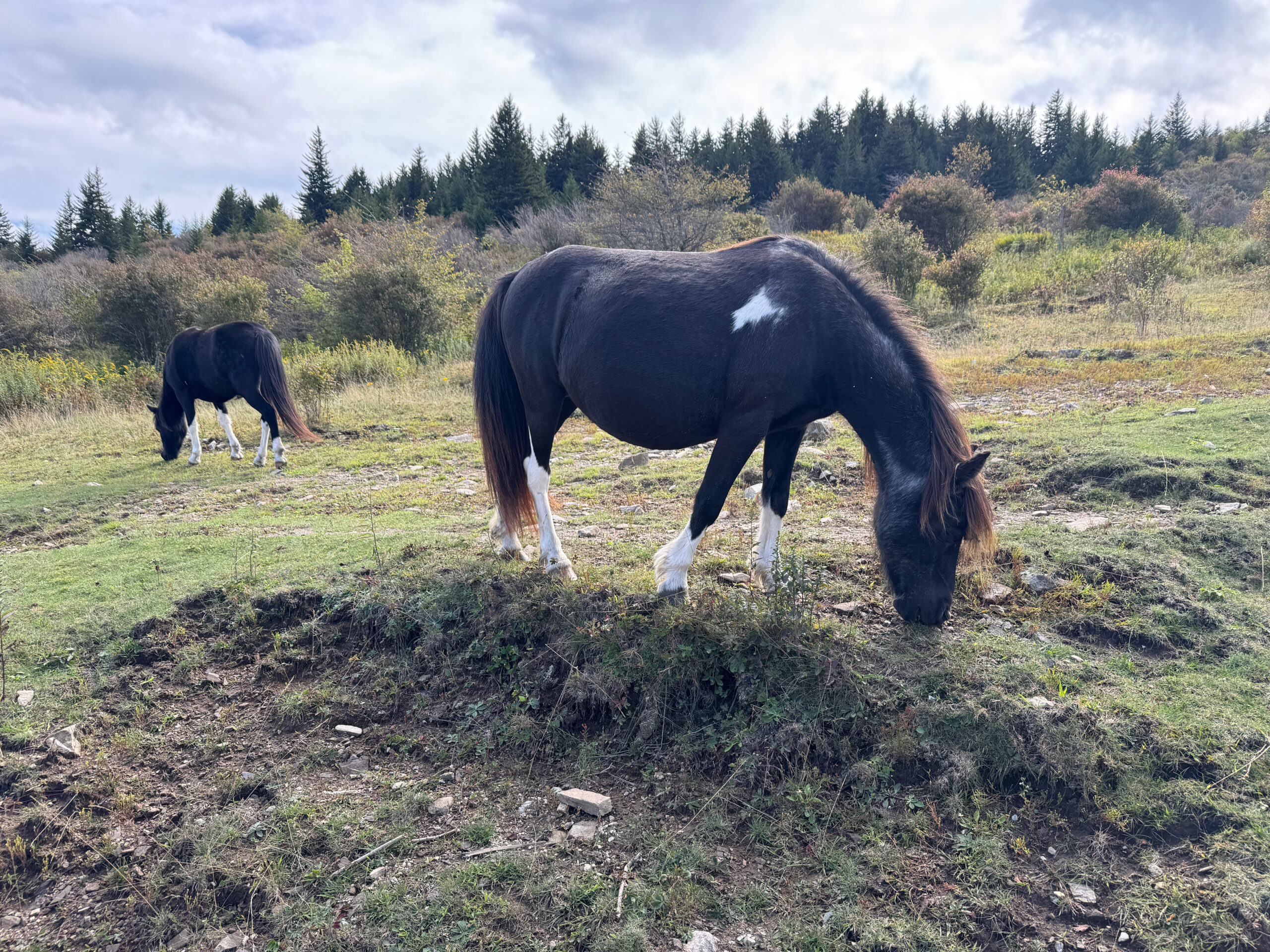 The weather was just perfect, with a good mixture of sun and clouds, a slight breeze, and a moderate temperature as we navigated the diversity of today’s section of the trail. It wasn’t until the very end of today’s journey that we met the wild ponies and Melanie, a lovely woman from Tennessee who drives over an hour and 45 minutes every other week to see the ponies. We learned that there are about 1,000 wild Spanish ponies, and they originally arrived between 1780 and 1790 and were used for farming in the mountains. Every fall they are gathered together and vet checked, and then a couple hundred of them are auctioned off to help fund winter food drops to help feed them during heavy snow. Lumpy warned us that the ponies love to lick the sweat off of hikers (because they don’t get any natural salt) and they also like hiking poles and backpack straps. I made sure to keep mine safe (sweat too). Melanie walked with us passionately talking about the ponies and how beautiful tomorrow’s hike will be for us all when we get to summit Mount Rodgers. I couldn’t help but marvel at her dedication and devotion to drive that far twice a month to see the ponies.